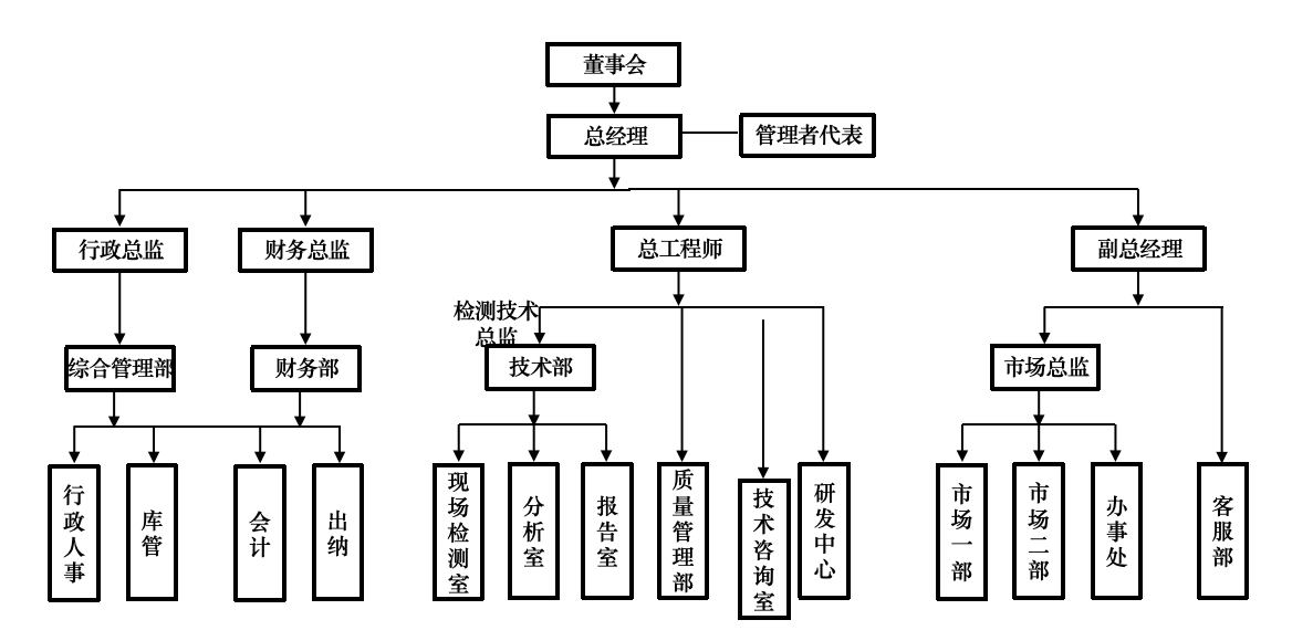 公司设有七个内设机构: 包括综合管理部、财务部、技术部(现场检测室、分析室、报告室)、质量管理部、技术咨询室、市场部、技术研发中心。