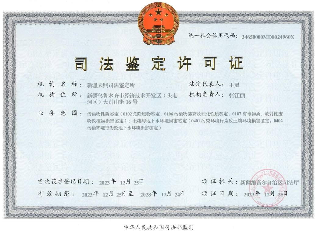 2023年12月通过新疆维吾尔自治区司法厅组织的司法鉴定人执业培训考核和机构评审,取得了司法鉴定许可证。可开展污染物性质鉴定、土壤与地下水环境损害鉴定业务。