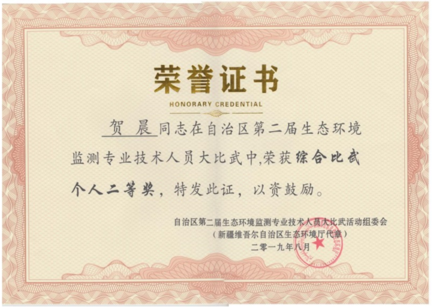贺晨系我单位总工程师助理,在2019年8月获得自治区第二届生态环境监测专业技术人员大比武综合比武个人二等奖: